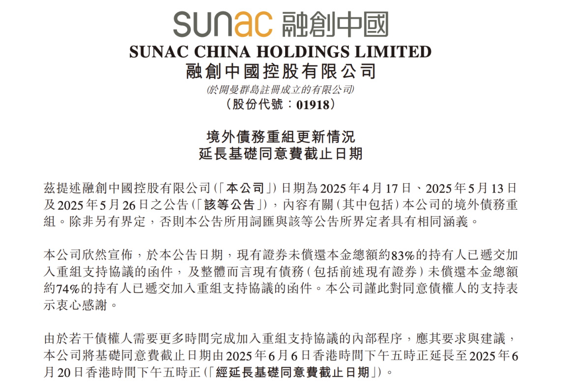 外界关注的融创境外债重组,再次取得进展。近日,融创公告境外债现有债务未偿还本金总额约74%的持有人已递交加入重组支持协议的函件。同时,由于若干债权人需要更多时间完成加入重组支持协议的内部程序,融创将基础同意费截止时间延至6月20日。基础同意费,即债务重组过程中,债权人同意参与重组计划所需支付的费用。